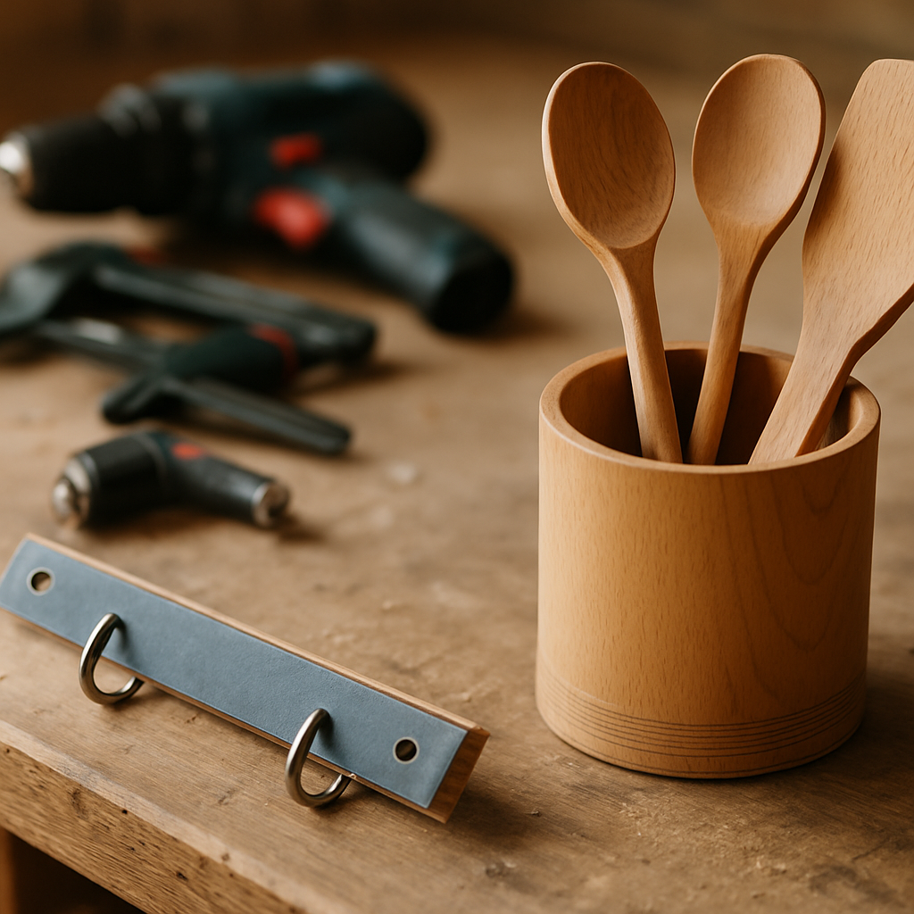 Ein idealer Einstiegsbau: Ein stehender Holz-Halter, der Kochlöffel und Pfannenwender aufnimmt. Er ist schnell gefertigt, hübsch und praktisch — perfekt, um das Erlernte anzuwenden.